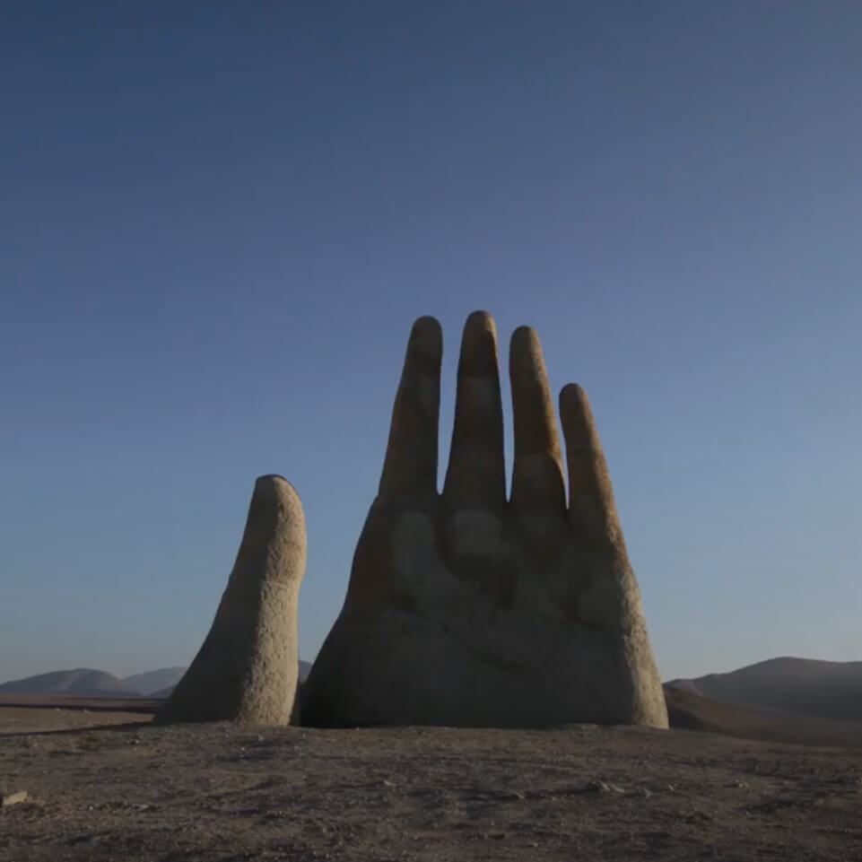 En el corazón del Desierto de Atacama, al sur de la ciudad de Antofagasta, emerge esta icónica escultura de 11 metros, del artista chileno Mario Irarrázabal. Enormes manos de piedra elaboradas por este mismo artista se hallan también en Punta del Este, en Madrid y en Venecia.