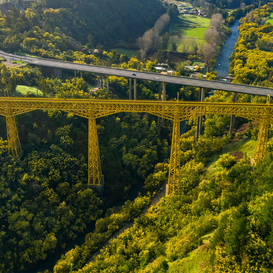 Con sus 102 metros de altura, el Viaducto del Malleco, en la Región de La Araucanía, es una de las mayores obras de ingeniería metálica en Chile, y fue considerado en su época el puente ferroviario más alto del mundo.