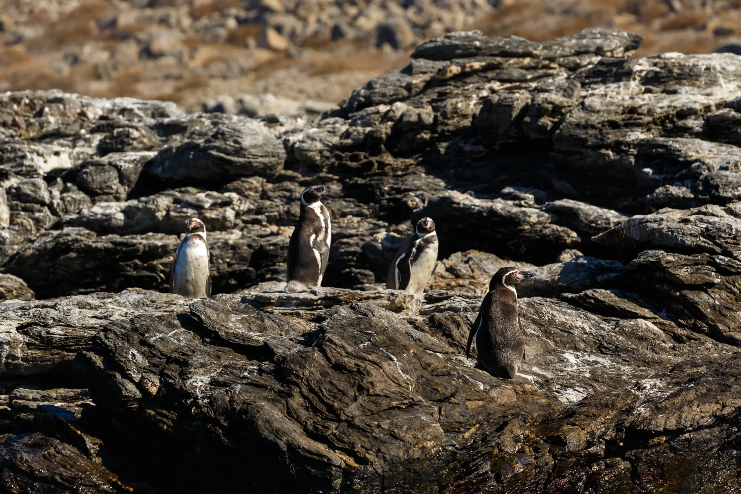 En el norte de Chile, un grupo de pingüinos descansa sobre rocas en la Reserva Nacional Pingüino de Humboldt, ecosistema costero de gran valor para la biodiversidad marina.
