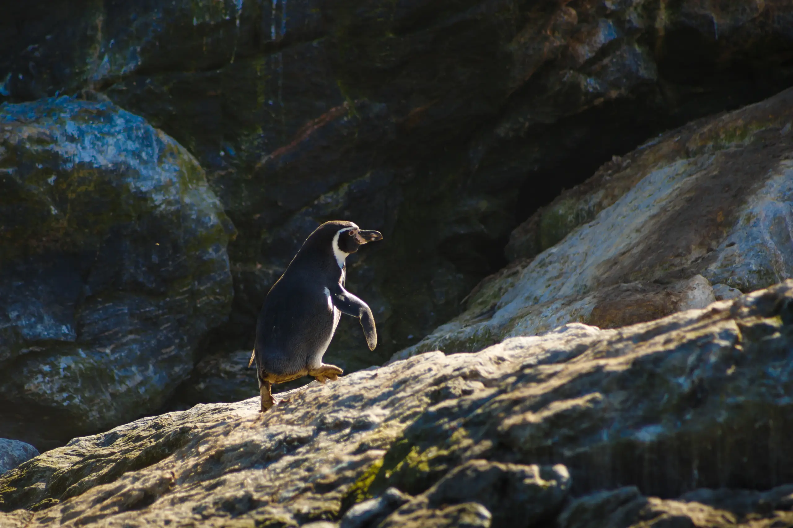 Un ave camina por la Reserva Nacional Pingüino de Humboldt, especie protegida y símbolo de la fauna marina del país.