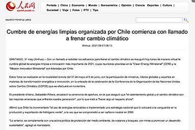 The year of renewable energies: Chile was positioned, for the fourth consecutive year, among the top places in the world in attractiveness for investments in clean energies, according to Bloomberg's Climatescope 2021. In addition, our country hosted the CEM12/MI6 global summit, the most important meeting on clean energy and innovation in 2021. Several announcements or projects were inaugurated during the year. In June Cerro Dominador, the first solar power plant in Latin America, was inaugurated, and in September the construction of Horizonte, which will be the largest wind farm in Latin America, was announced. In 2021, the construction of the largest green hydrogen plant in Latin America, Haru Oni, was also started, and in December, the 6 winning companies or consortiums of the financing round of the National Green Hydrogen Strategy were announced, with projects that will attract investments of US$ 1 billion.