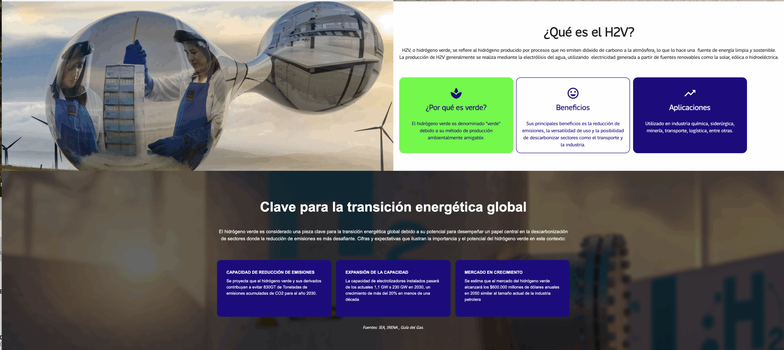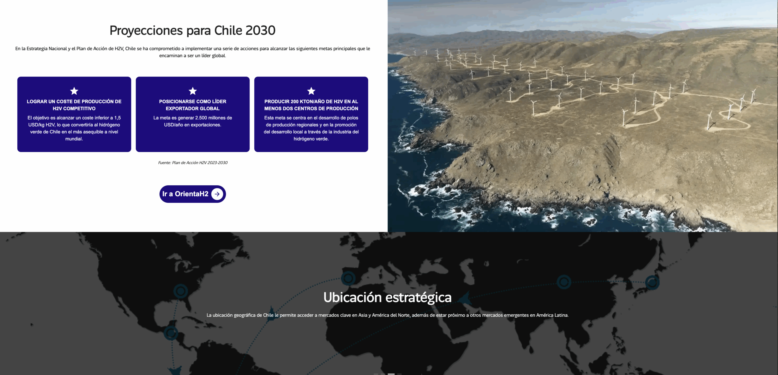 Esta plataforma web que facilita la navegación y conexión dentro del ecosistema del hidrógeno verde en Chile, financiado por el Ministerio de Energía y ejecutada por la Agencia de Sostenibilidad Energética en colaboración con Clio Consulting, utilizo el sistema gráfico del hidrógeno verde chileno para graficar la sección del sitio que explica qué es el H2V y el potencial que tiene el país en esta materia.