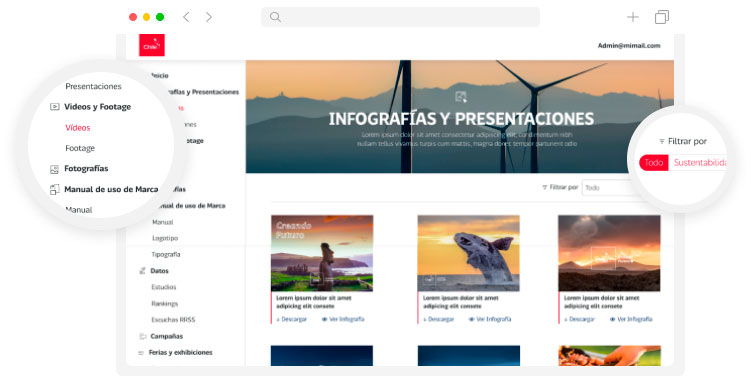 Una amplia selección de imágenes, infografías, presentaciones, videos, entre otros materiales, segmentados según los tres ejes del relato de Chile que impulsa colaborativamente la Fundación Imagen de Chile: sustentabilidad, democracia y diversidad.